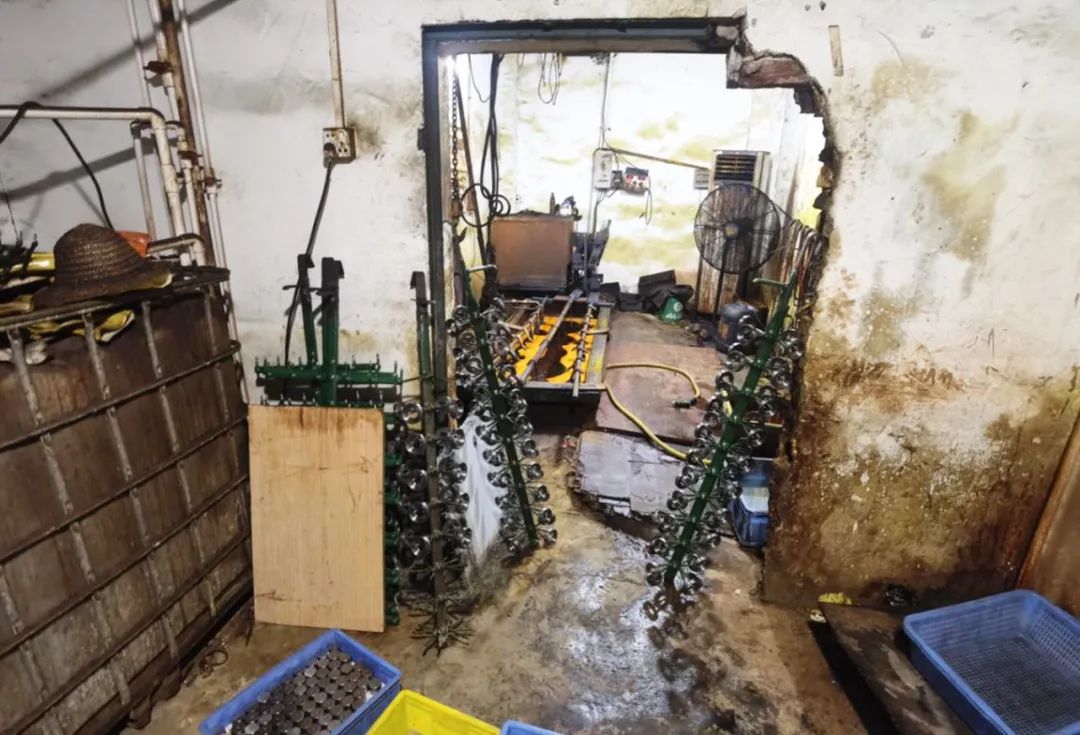 執(zhí)法人員對該作坊的環(huán)境違法行為制作了雙筆錄,對該作坊電鍍工序的電源總電箱、生產車間進行了查封,并對電鍍車間內的清洗盆、廠區(qū)雨水總出口、雨水渠與廠外市政污水管網交匯井取樣檢測,檢測報告顯示,該作坊廢水排放出口處的廢水總鉻超標927倍,其他監(jiān)測點位排放的廢水同樣重金屬超標!